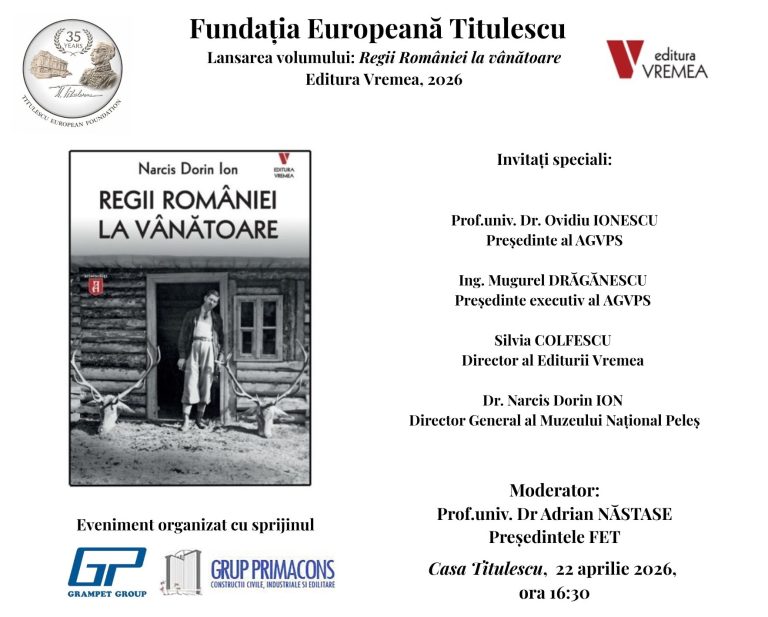 Fundația Europeană Titulescu vă invită miercuri, 22 aprilie 2026, începând cu ora 16.30, la lansarea volumului: ,,Regii României la vânătoare”....