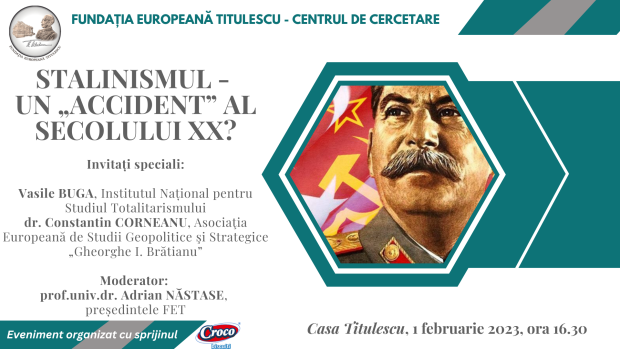 Fundația Europeană Titulescu – Centrul de Cercetare organizează miercuri, 1 februarie 2023, începând cu ora 16.30, dezbaterea cu tema ”Stalinismul – un ”accident” al secolului XX?”. Invitați speciali: Vasile BUGA, cercetător asociat, Institutul Național pentru Studiul Totalitarismului și dr. Constantin CORNEANU, președintele Consiliului-Director al Asociației Europene de Studii Geopolitice şi Strategice „Gheorghe I. Brătianu”. Moderator: …