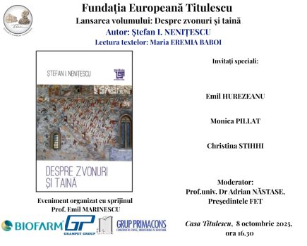 Fundația Europeană Titulescu vă invită miercuri, 8 octombrie 2025, începând cu ora 16.30, la lansarea volumului: Despre zvonuri și taină. Autor: Ștefan NENIȚESCU. Lectura textelor: Maria EREMIA BABOI. Invitați speciali: Emil HUREZEANU Monica PILLAT Christina STIHHI Moderator: Prof.univ. Dr Adrian NĂSTASE, Președintele FET. Evenimentul se va desfășura la Casa Titulescu, Șos. Kiseleff nr. 47, sector …