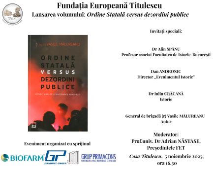 Fundația Europeană Titulescu vă invită marți, 11 noiembrie 2025, începând cu ora 13.00, la lansarea volumului: Arta de a conduce. Discursuri politice 2000-2013. Autor: Adrian Năstase. Invitati speciali: Sorin GRINDEANU Florin ABRAHAM Dan CONSTANTIN Dan ANDRONIC Evenimentul se va desfășura la Restaurantul Diplomat (în incinta Clubului Diplomatic), Șoseaua București-Ploiești nr. 2B, București. Sponsorii FET: Biofarm …