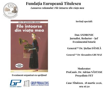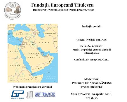 Fundația Europeană Titulescu vă invită miercuri, 29 aprilie 2026, începând cu ora 16.30, la dezbaterea Orientul Mijlociu: trecut, prezent, viitor. Invitați speciali: General (r) Silviu PREDOIU Dr. Ștefan POPESCU, Analist de politică externă și relații internaționale Conf.univ. dr. Ionuț COJOCARU Moderator: Prof.univ. Dr Adrian NĂSTASE, Președintele FET. Evenimentul se va desfășura la Casa Titulescu, Șos. …